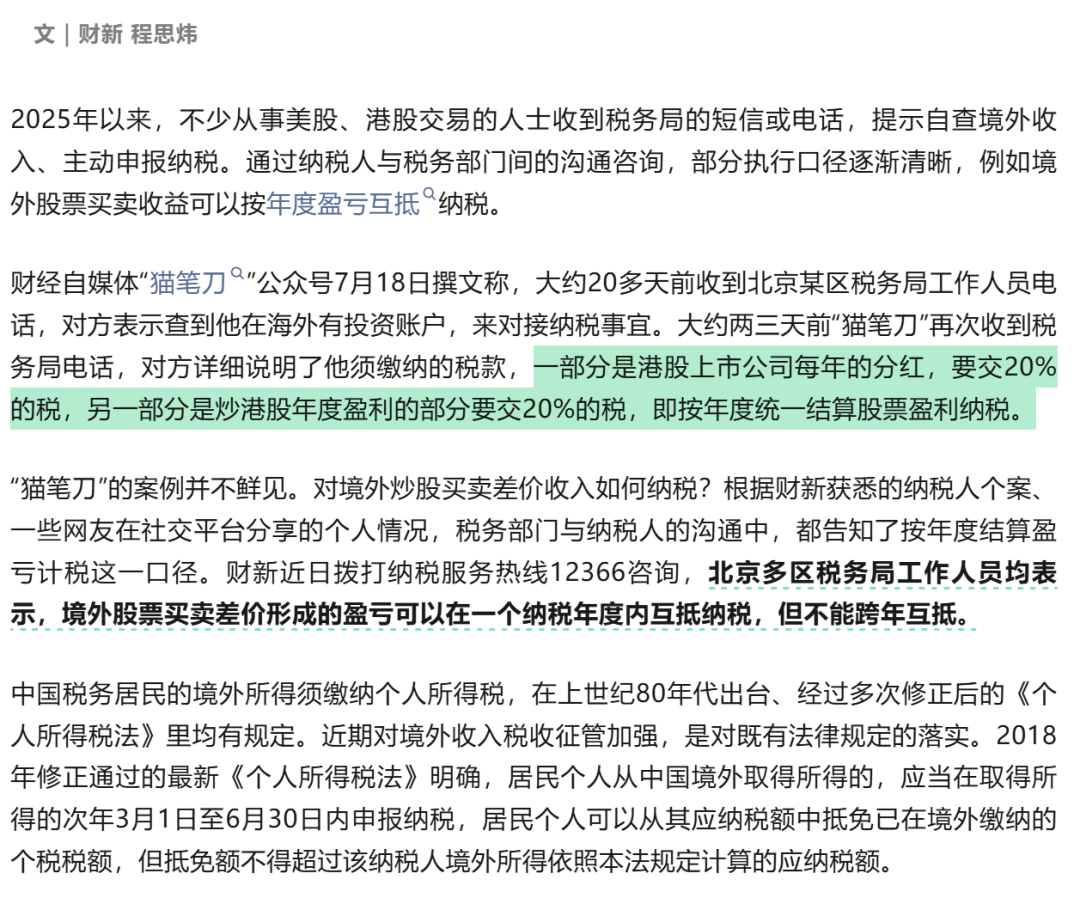 然而,如果你是通过海外证券投资港美股,在年度盈亏抵消后的应当缴纳20%的个人所得税(资本利得+红利)。