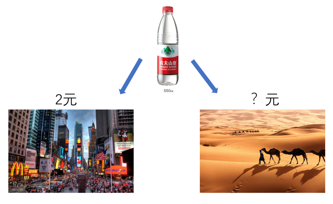 一瓶水,在城市里价值2元,在沙漠中可值10元,20元,100元!