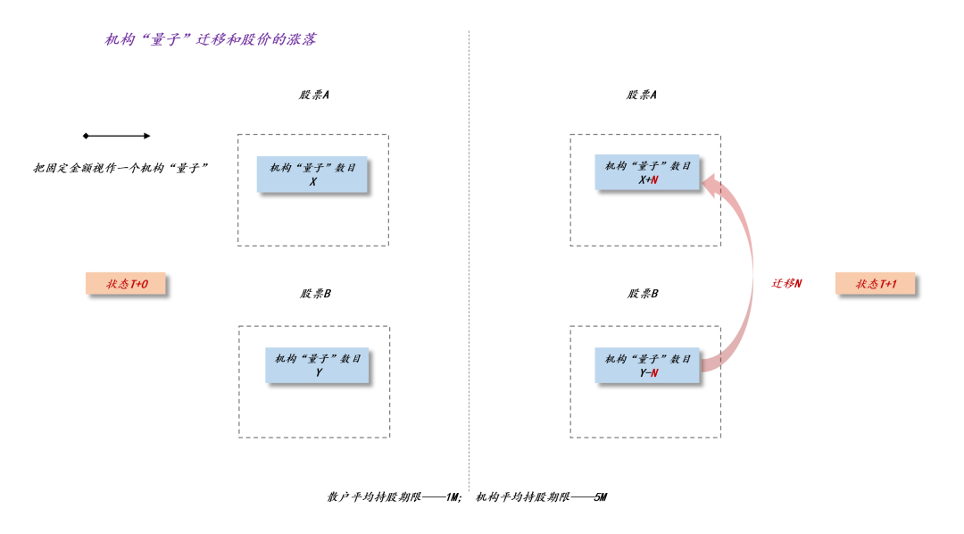 为了简化起见,我们还可以把机构资金按照某个固定金额量子化,如上图所示,在T+0时刻,股票A中机构“量子”数目为X,股票B中机构“量子”数目为Y;在T+1时刻,有N份机构“量子”从Y迁移至X;于是,股票A的市值出现一定程度的上涨,股票B的市值出现一定程度的下降。