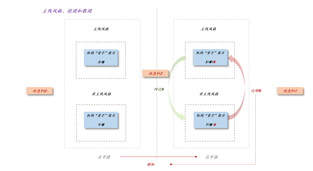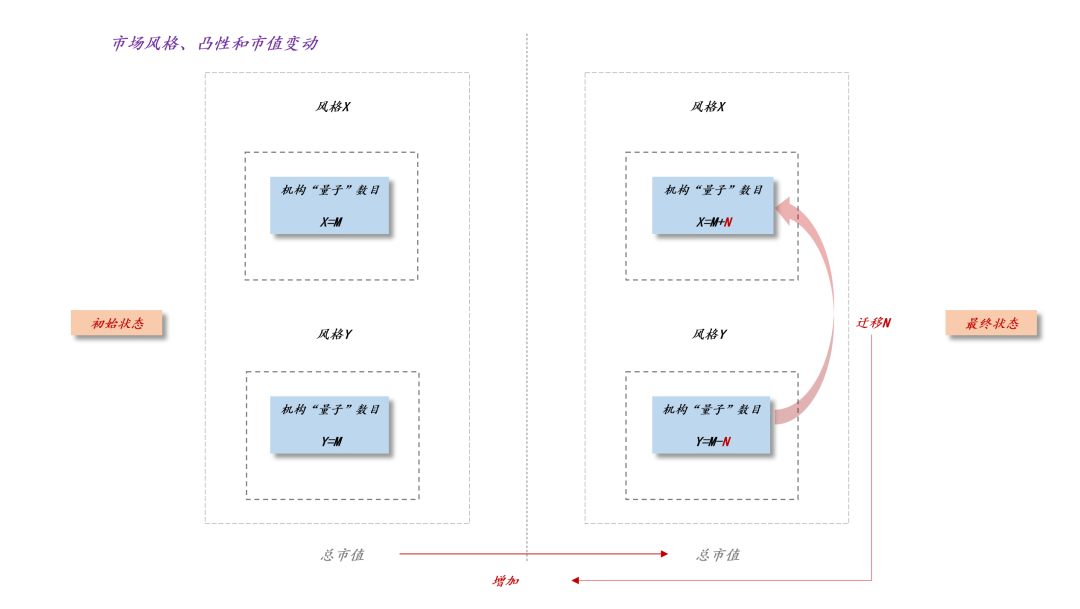 如上图所示,在初始状态下风格X和风格Y是均衡的,二者的机构“量子”数目均为M,根据琴森不等式,这时候整个股市的市值最低,韧性最强。