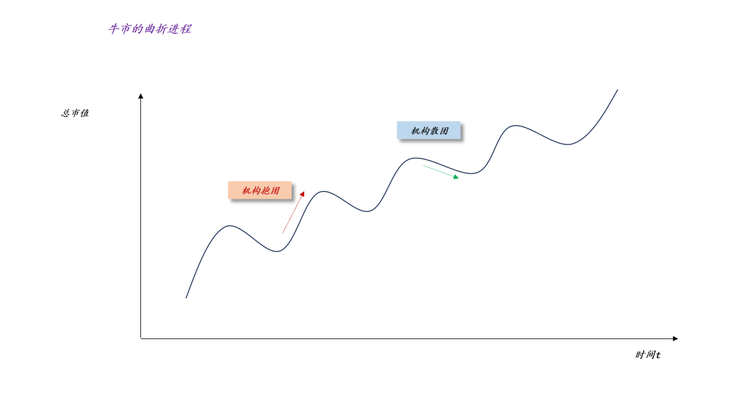 于是,我们就有了上图,牛市进程的曲折性是不可避免的,1、机构周期性地抱团和散团,制造短期波动;2、长期牛市则来自于增量资金的持续流入。