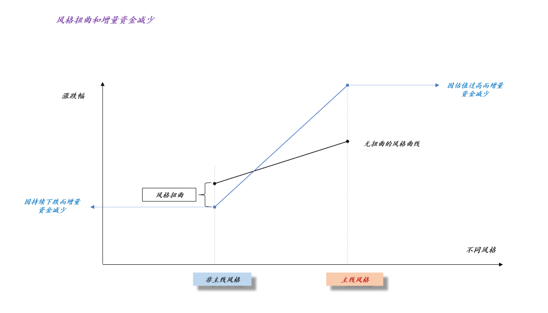 上图刻画了风格扭曲对增量资金的抑制,当风格曲线严重偏离基准情形时会产生两个效应: