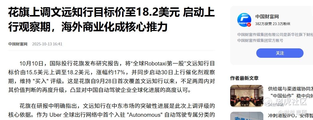 $文远知行(WRD)$ 10月10日,国际投行花旗发布研究报告,将“全球Robotaxi第一股”文远知行目标价由15.5美元上调至18.2美元,涨幅约17%,并同步启动30日上行催化剂观察期,维持 "买入" 评级。这是花旗自9月28日首次覆盖文远知行以来,不足两周内对其价值判断的再度升级,凸显对中国自动驾驶企业全球化进展的高度认可。