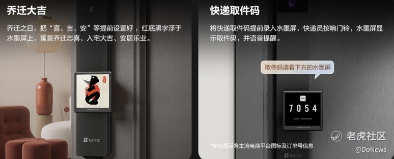 一是情感化交互创新。Y5000FVX Ultra行业首创可自定义的水墨屏偏位把手设计,打破行业材质同质化困局。用户不仅能通过萤石云APP,自定义水墨屏背景,让智能锁成为传递情感、表达个性的载体。且针对网购时代的高频退货需求,用户也可通过APP设置取件码,简化退货流程,兼具情绪价值与实用价值。