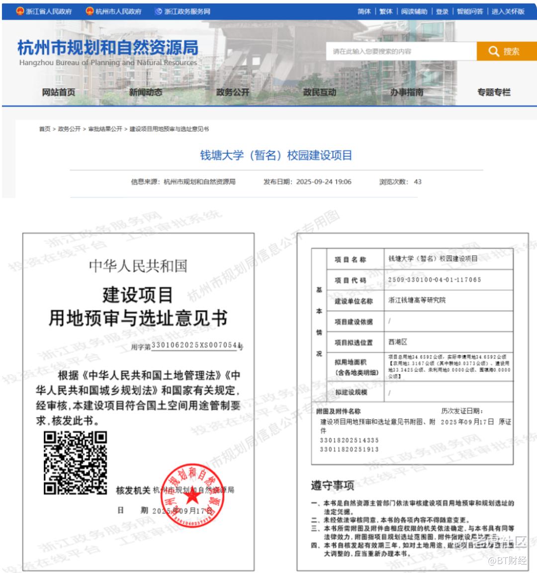 近日,杭州市规划和自然资源局公布钱塘大学(暂名)校园建设项目用地审批与选址意见书,项目选址位于西湖区,项目用地涉及转塘单元XH100201-09、XH100201-18、XH100201-35地块及周边配套道路,用地总面积达36.3公顷。这次用地获批,是钱塘大学建设进程中具有里程碑意义的关键一步。