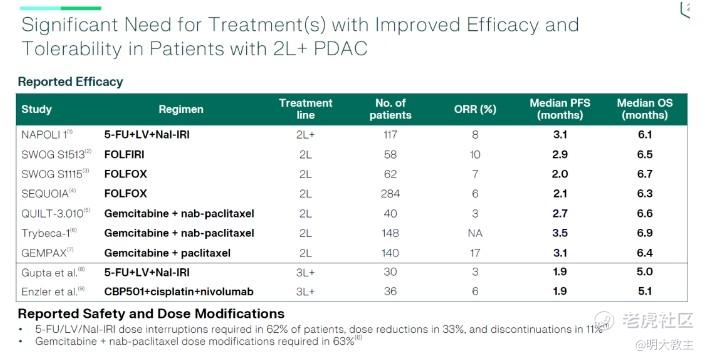 伊立替康脂质体联合5-氟尿嘧啶/亚叶酸钙方案作为胰腺癌二线治疗的I级推荐方案,中位PFS为3.1个月,中位OS为6.1个月。目前胰腺癌三线治疗无标准治疗,历史数据报道胰腺癌三线治疗方案ORR极低,mOS约6个月。