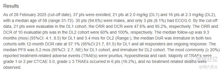 2024年ASCO上公布的乐普生物MRG004A治疗胰腺癌患者初步数据显示,在既往接受过中位3线治疗的患者中,MRG004A的ORR 33.3%,DCR 83.3%。其中,在5例TF高表达(TF≥50%)且治疗线数2线以内的亚组中,4例PR,DCR 100%。接受MRG004A治疗的患者只有7.9%曾出现严重不良事件,3-4级治疗相关不良反应的发生率25%。MRG004A有效性、安全性初步显现。