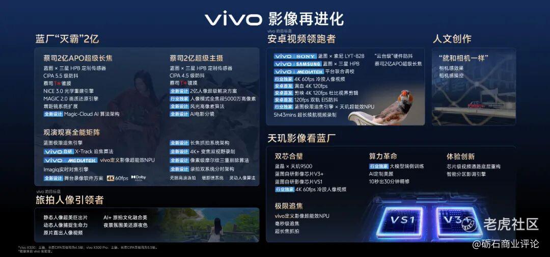 例如,通过自研影像芯片V3与天玑9500的“双芯合体”,打造了X300系列「蓝晶×天玑9500」的强大影像中枢, 实现了其它安卓手机与苹果手机都未曾做到的电影级虚化和4K画质下的高帧率视频录制;与三星、MTK三方联合定制了行业独家的蓝图HPB传感器,带来行业领先的2亿超级长焦;与索尼联合定义了LYT-828云台级主摄;在X300标准版上,配备了与三星、MTK三方软硬一体化定制的行业最领先的2亿影像主摄;配备了第四颗蔡司镜头——vivo蔡司2.35×长焦增距镜,为用户提供更接近专业相机的高质量拍摄体验......