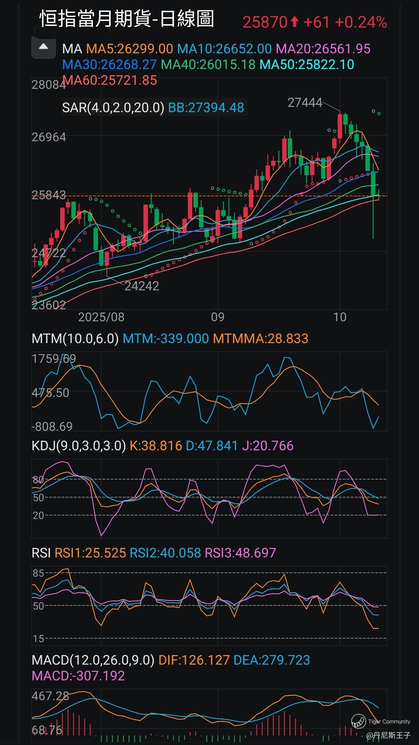 恒生指数位于(5,10,20,30,40)天移动平均日线之下,(5,10,20)天移动平均日线趋势向下