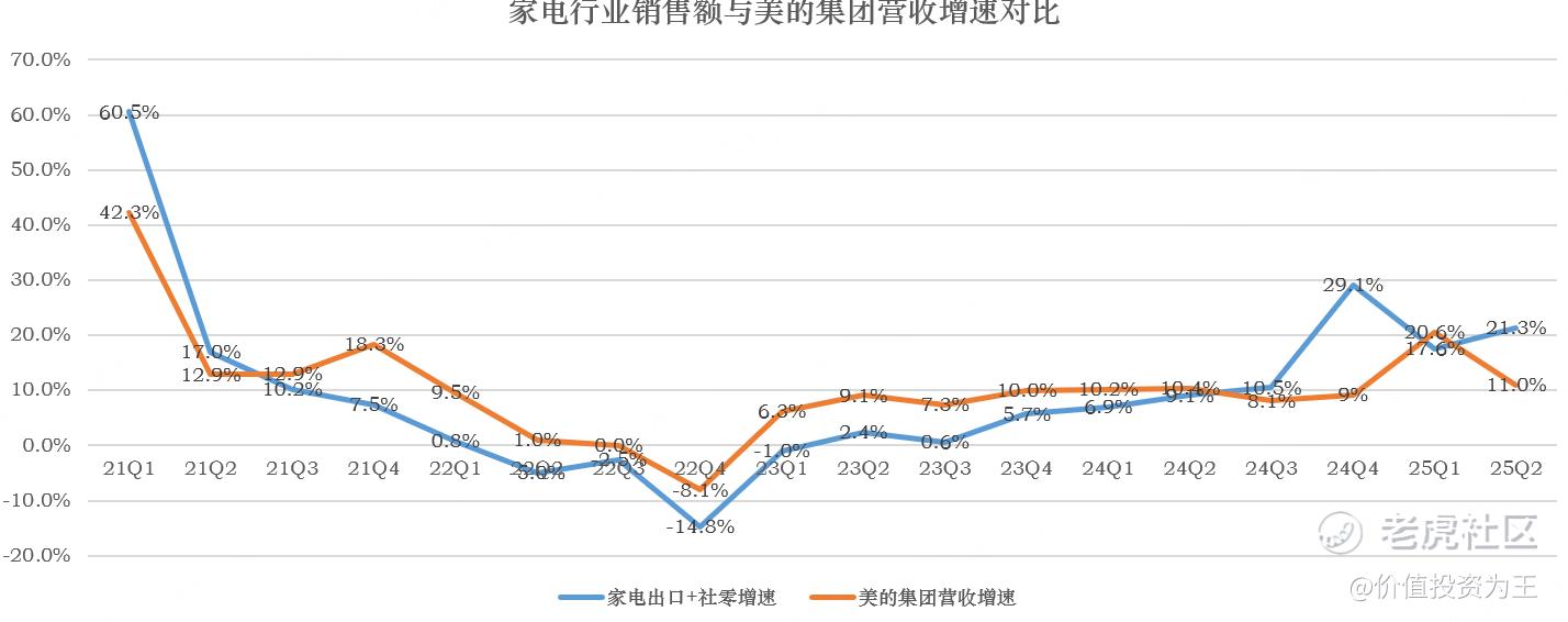 将出口数据和内销叠加,就得到了家电行业整体销售数据,与美的集团季度营收增速相比,两者之间有极强的关联性: