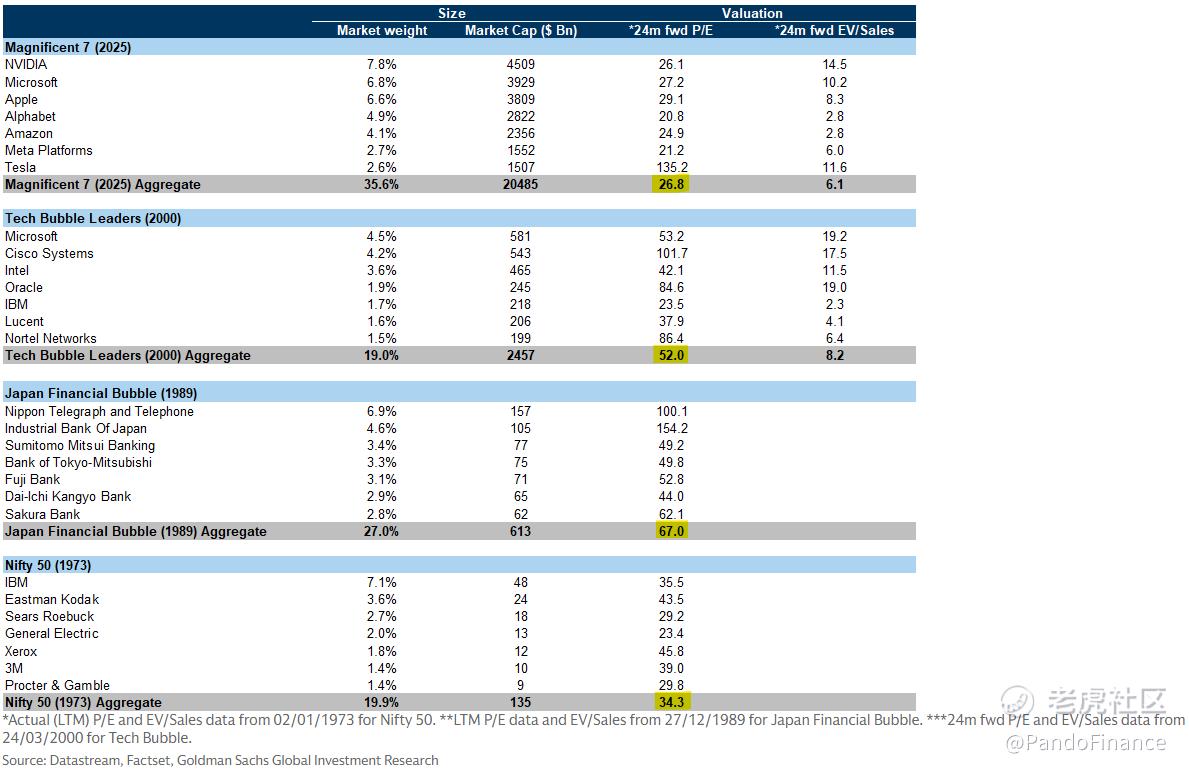 当前市场的强势表现有基本面成长支撑,主要驱动力来自 AI,且企业获利仍足以支撑当前估值,与 2000 年网络泡沫时期仅靠对于未来想象推高的情况不同。以Magnificent 7为例,当前的平均估值与以往股市泡沫时的明星股相比并不高。