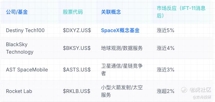 SpaceX作为非上市公司,其进度直接影响整个商业航天产业链的投资情绪。IFT-11的成功,立刻刺激了美股市场上相关太空概念股的集体上行。