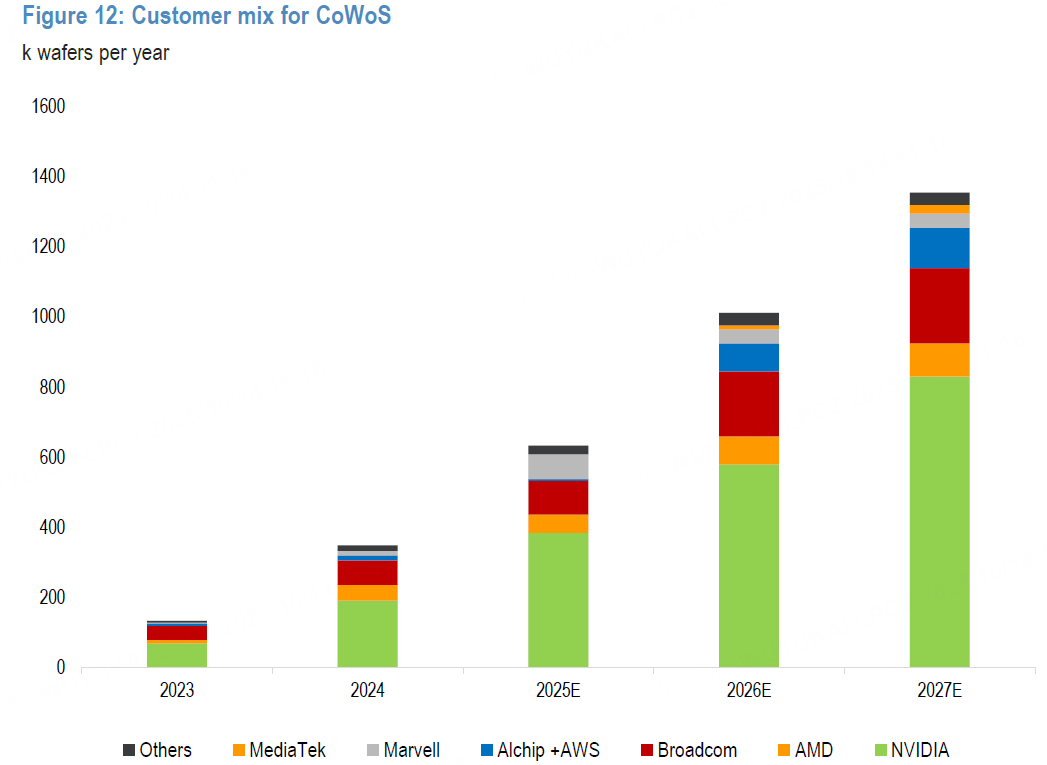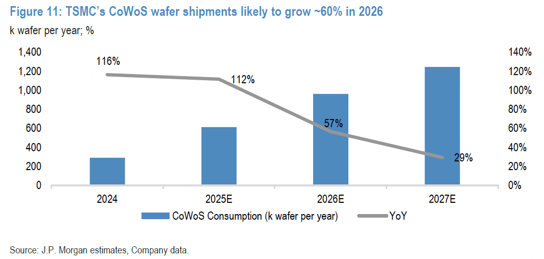 前四大云服务商(CSP) $亚马逊(AMZN)$ $微软(MSFT)$ $谷歌(GOOG)$ 正在加速AI投入——2026年资本支出预计同比再增20%,甚至更高。供应链数据显示,硬件占比显著上升,其中台积电CoWoS晶圆出货量预计到2026年增长约60%。