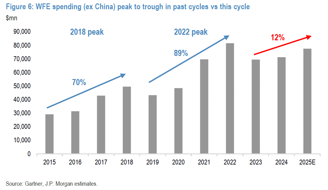 过去典型的科技泡沫往往是“需求骤起—供给过度扩产—周期反转”的老戏码,而这次完全不同。当前全球晶圆厂设备支出仅从2023年低点反弹8%(若剔除中国则为12%),远低于历史上行周期的80%。也就是说,这轮AI驱动的科技上行仍处于早期阶段。