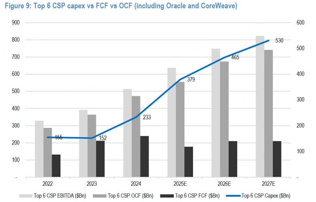 从资金来源看,大型云厂商的AI投资基本依靠现金流支撑,债务杠杆有限,短期风险可控。即便如 $甲骨文(ORCL)$ 、 $CoreWeave, Inc.(CRWV)$ 的融资结构更依赖债务,它们的整体支出占比也仅约11%。