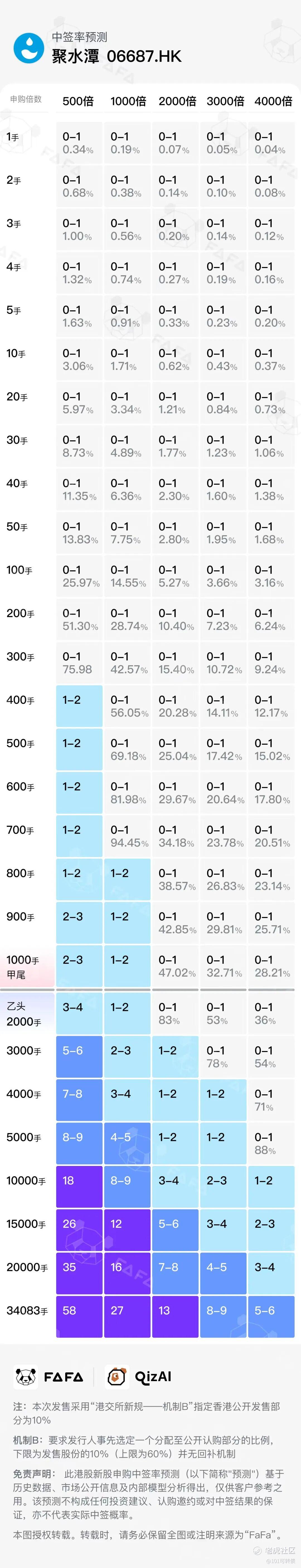 聚水潭此次招股采用机制B,回拨10%,公开发售是681.67万股,一手是100股,68167手,甲乙组各34084手,中签率稍高,甲尾中1手几率大,甲尾需31万港元本金,乙头需62万港元本金;目前孖展不到100倍,等云迹资金释放后,可以打聚水潭,预计孖展会到2500倍;【注意:聚水潭跟广和通是冲突的】