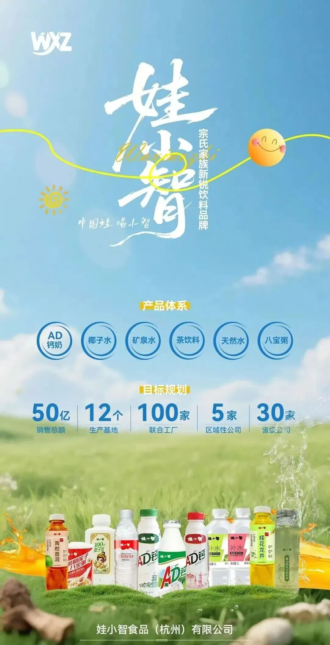 官方海报显示,娃小智产品体系包括AD钙奶、椰子水、矿泉水、茶饮料、天然水、八宝粥几大品类。