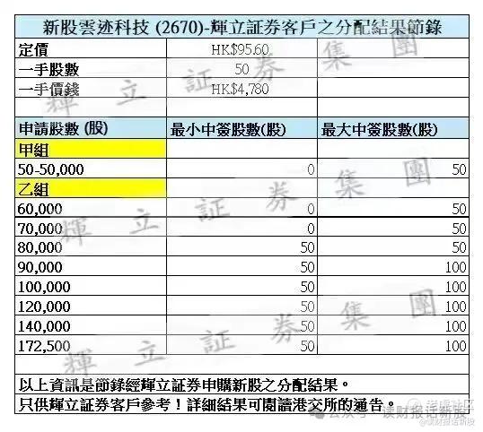 2、云迹 $云迹(02670)$ 今天中签结果也出来了
