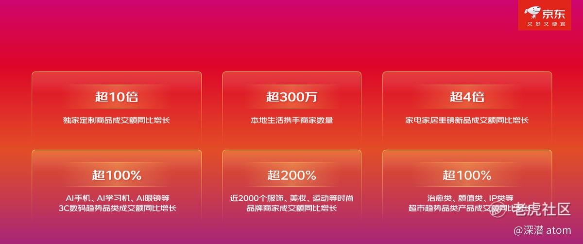 京喜自营助力出口转内销,带动外贸企业成交额同比增长20倍;京喜自营产业带优质白牌好物成交额同比增长3倍。此外,京东五金城购买用户数同比增长超63%,自营入仓品成交额增长133%,上千工业品品牌成交额倍增。京东企业购平台成交额同比增长超70%,中小企业客户数稳健攀升。