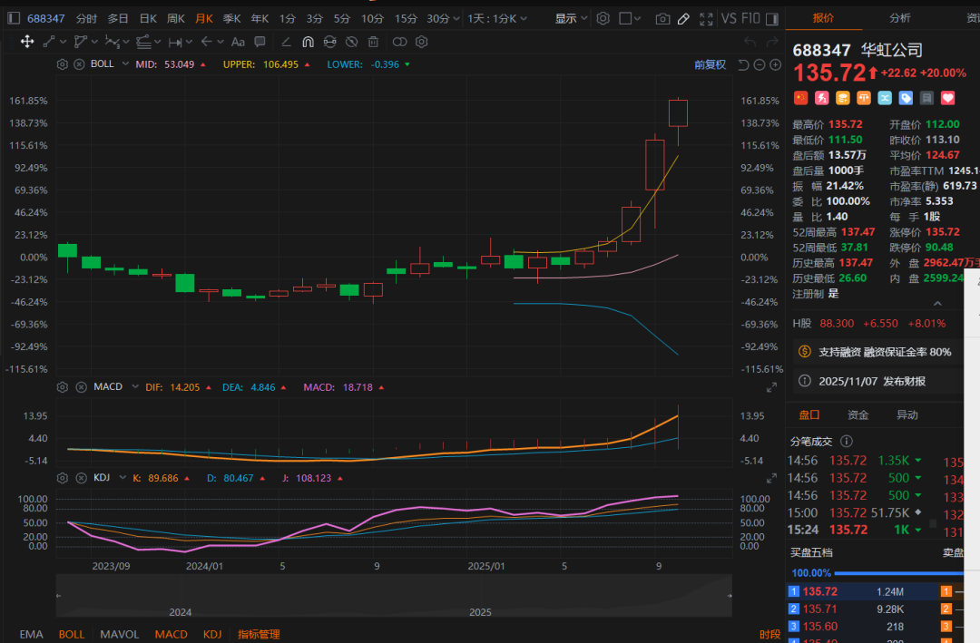 从技术面看,尽管今天华虹以涨停收盘,但成交量却出现异常放大,换手率高达15%,这明显是主力资金在拉高派发,散户跟风接盘的典型特征。回顾历史走势,每当个股出现这种“天量涨停”现象,往往意味着短期顶部即将形成。