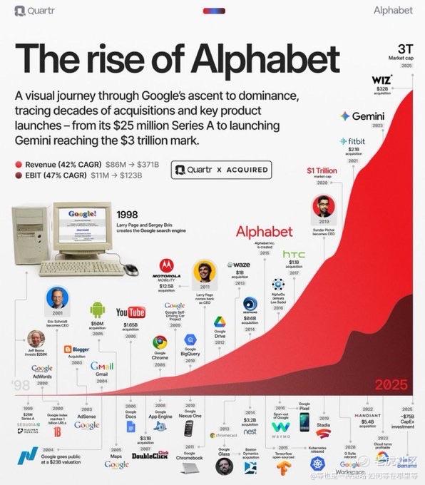 这张图表很好地展现了谷歌$GOOGL如何打造其价值 3 万亿美元的商业帝国。战略性收购、业务改进以及谷歌生态系统中不断涌现的全新业务板块,正是促成这一成就的因素。