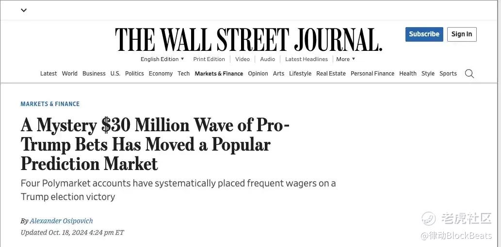 2024 年华尔街日报就特朗普选情引用 polymarket 实时数据变化|图源:Wall Street Journal