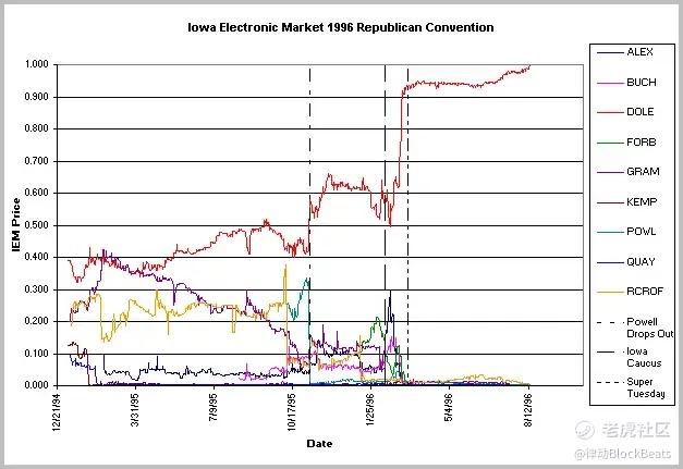 1996 年爱荷华大学数字预测市场对共和党全国代表大会结果的预测|图源:Iowa Electronic Markets