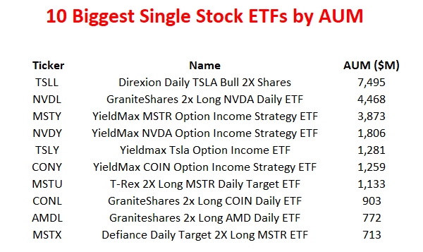10只最大的单一股票ETF,特斯拉和英伟达占据主导地位,代表240亿美元的资产,追踪 $特斯拉(TSLA)$ 、 $英伟达(NVDA)$ 、 $Strategy(MSTR)$ 、 $Coinbase Global, Inc.(COIN)$ 和 $美国超微公司(AMD)$ 等股票。