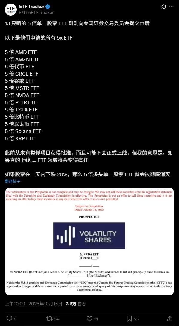 此外,据悉,还有13只新的5倍单一股票ETF刚刚向SEC提交申请,包括5倍 $美国超微公司(AMD)$ , $亚马逊(AMZN)$ , $Circle Internet Corp.(CRCL)$ , $谷歌(GOOG)$ , $Strategy(MSTR)$ , $英伟达(NVDA)$ , $Palantir Technologies Inc.(PLTR)$ , $特斯拉(TSLA)$ , $比特币(BTC.USD.CC)$ , $以太坊(ETH.USD.CC)$ 等。