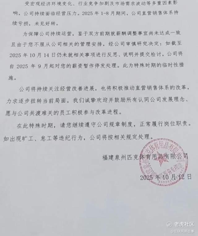 10月13日,多个媒体报道称,有相关员在社交媒体上透露匹克公司向拒绝降薪的员工发出“最后通牒”,要求其在10月14日前提交“反思检讨”,否则将面临停发9月份工资的处罚,并且还贴出了盖了匹克公司红章的文件。