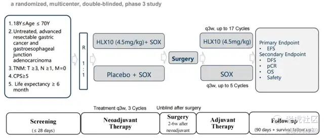 研究入组患者1:1随机分为两组:试验组先接受3个周期H药(4.5 mg/kg)联合SOX方案治疗;对照组接受安慰剂联合SOX方案治疗。新辅助治疗结束后2-6周内进行手术切除。术后辅助治疗阶段,试验组继续接受最多17个周期H药单药治疗;对照组接受最多5个周期的SOX方案辅助治疗。