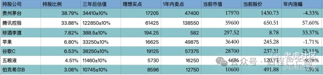 目前十大持仓:贵州茅台39%,腾讯34%,珍酒李渡7%,苹果7%,谷歌6%,五粮液4%,伯克希尔3%。目前九大持仓占比88%(其中科技股占比47%,白酒股占比50%;A股占比43%,港股占比41%,美股占比16%),还有12%观察仓和现金。
