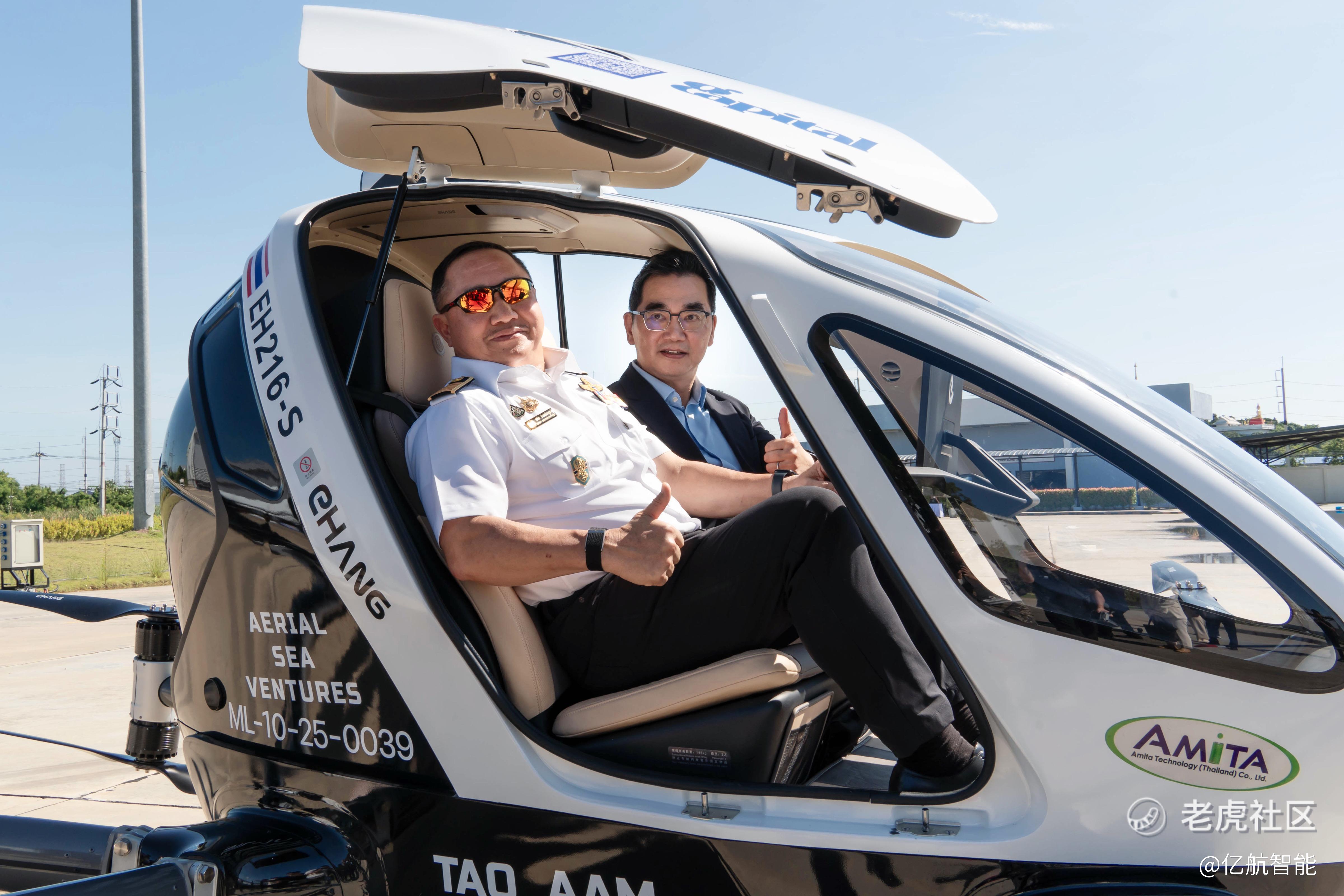 图:亿航智能首席财务官杨嘉宏先生与泰国民航局局长Marshal Manat Chavanaprajoon先生共同体验EH216-S