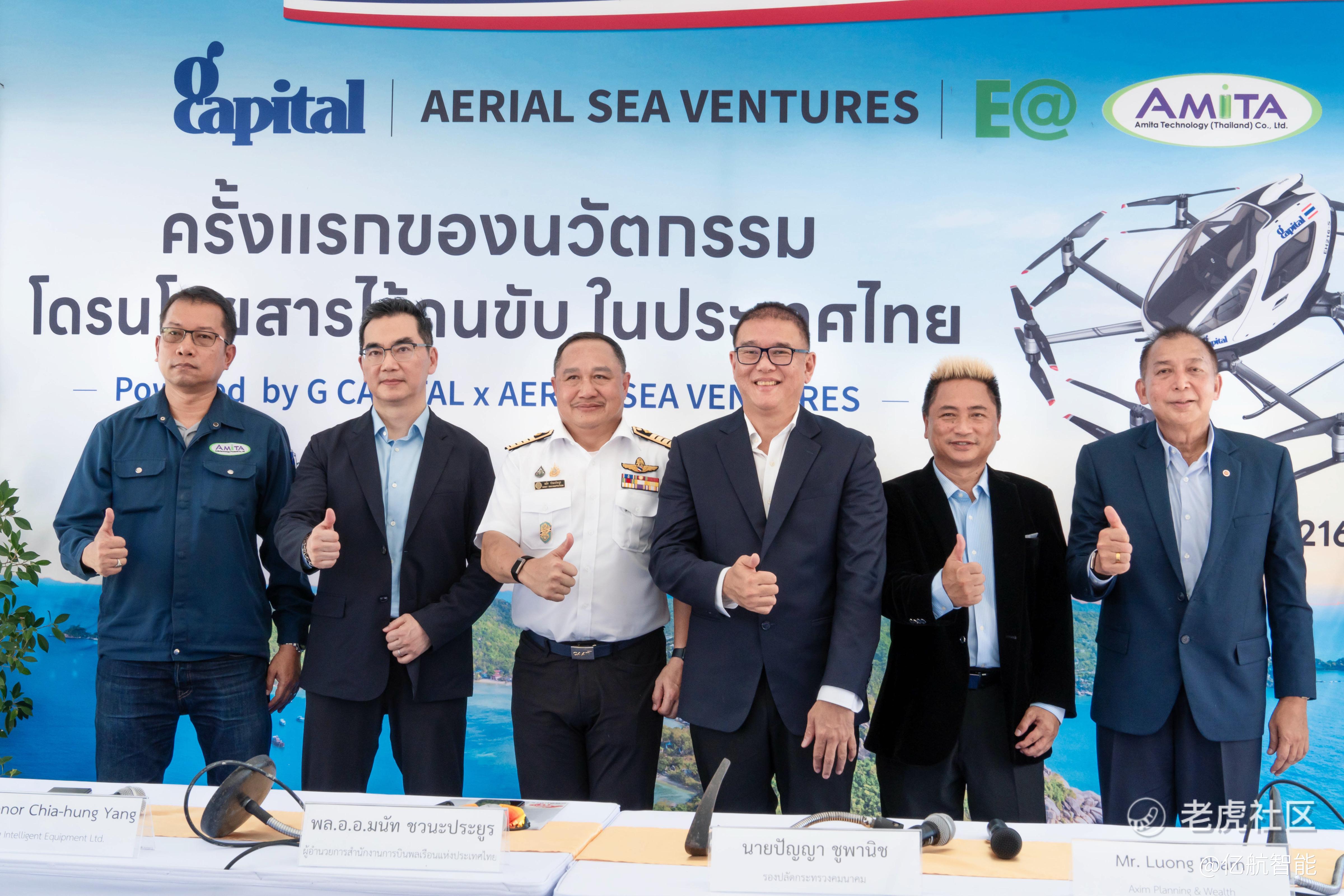 图:从左至右依次为:AMITA副首席执行官Chakrawut Raisaeng先生、亿航智能首席财务官杨嘉宏先生、泰国民航局局长Marshal Manat Chavanaprajoon先生、泰国交通部常务副秘书 Panya Chupanit 先生、Aerial Sea Ventures首席执行官Luong Pham先生、G Capital首席执行官Anuwat Kosol先生