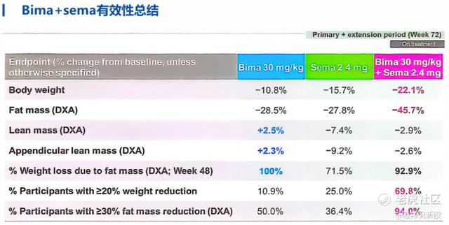 2025 ADA最新披露Bima+司美格鲁肽联合治疗组在第72周实现减重22.1%(92.9%来自于脂肪),肌肉只损失2.9%。