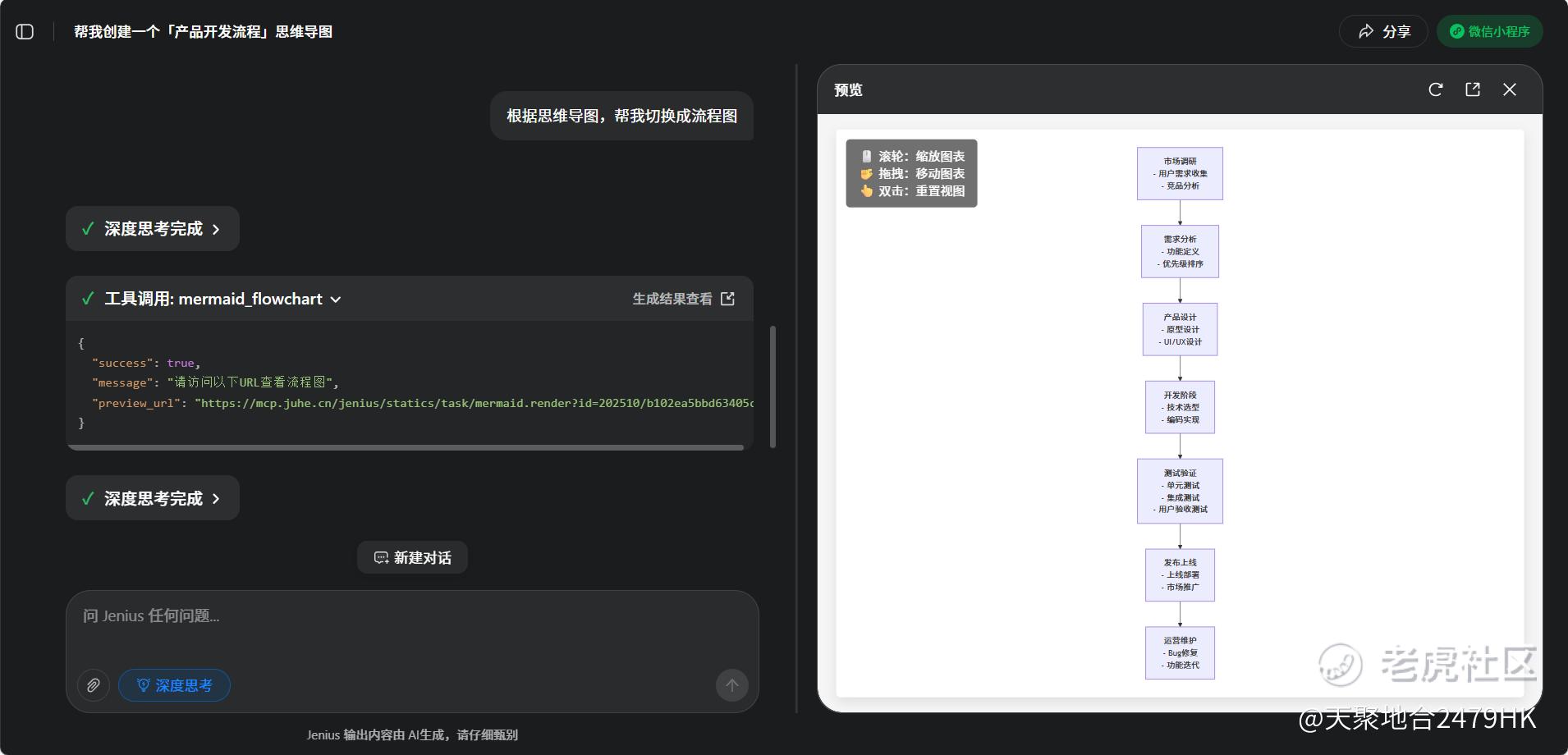 若生成后有其他图表形式需求,可以向 Jenius 发送切换流程图的指令,Jenius 调用 mermaid_flowchart 工具,严格遵循7大阶段顺序切换为流程图。