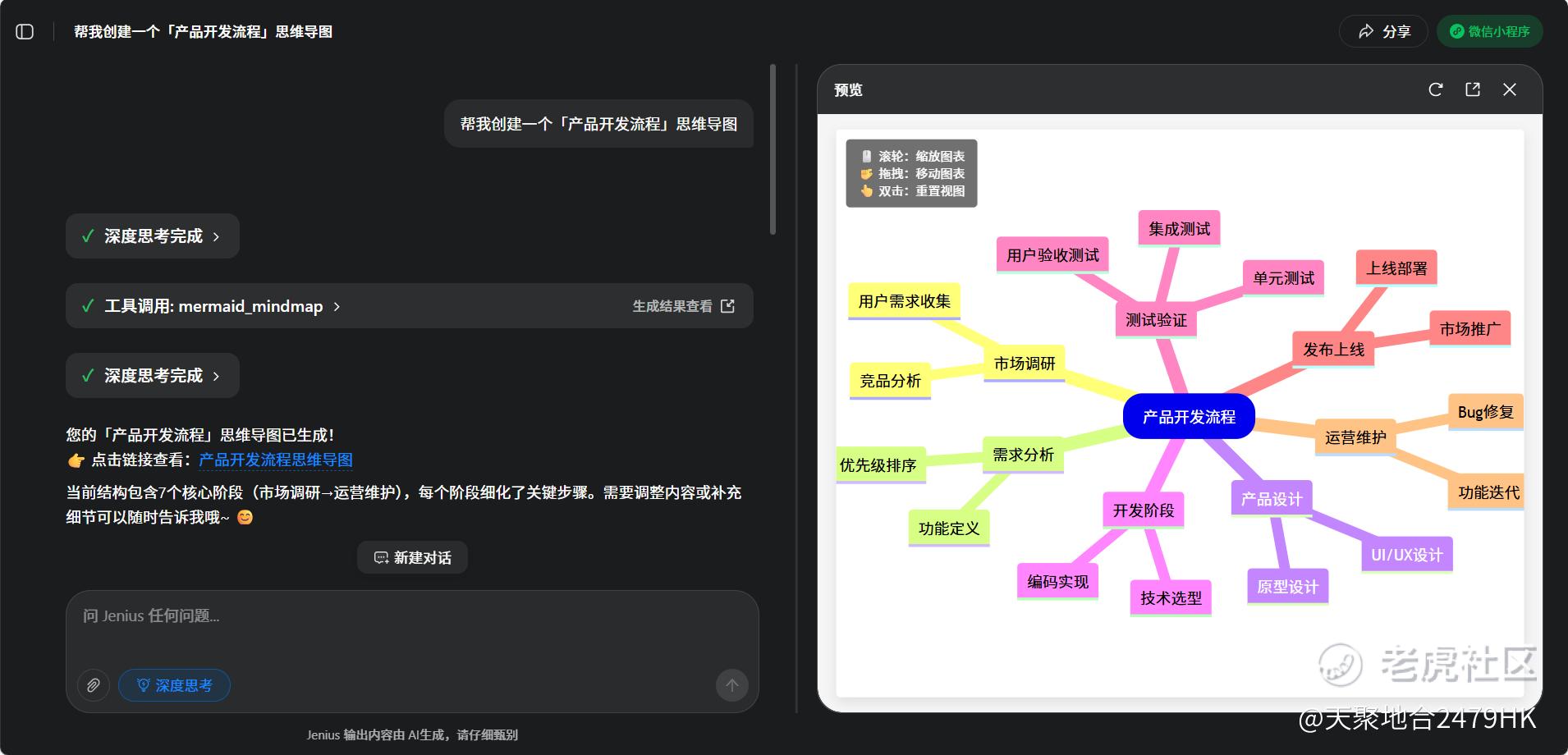 向 Jenius 输入创建一个「产品开发流程」思维导图的指令,Jenius 通过调用 mermaid_mindmap 工具,根据产品开发的7个核心阶段生成发散性思维导图。