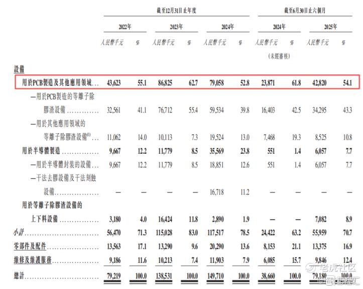 按产品线划分,用于PCB制造的等离子除胶渣设备是公司的主要收入来源,报告期内收入占比分别为41.1%、55.4%、39.8%及43.3%。