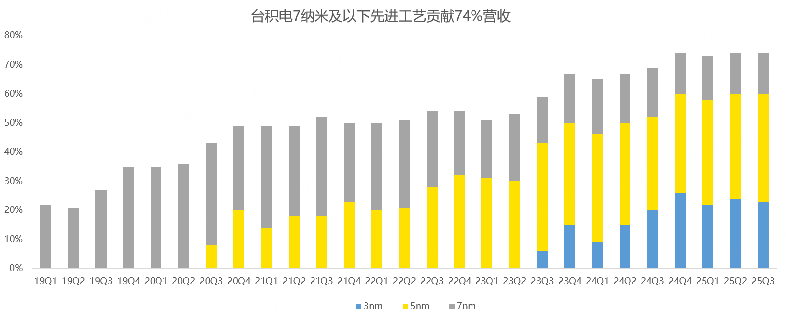 分生产工艺看,三季度3纳米工艺贡献了23%的收入,5纳米37%,7纳米及以下先进工艺贡献了74%的收入,和上一季度持平: