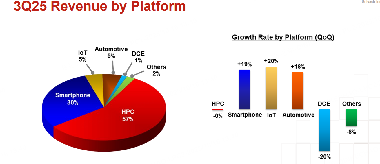 分终端市场看,三季度高性能计算(HPC)贡献了57%的收入,环比持平,令人略感意外。智能手机三季度贡献了30%的收入,环比大增19%,或是苹果手机需求旺盛带动。其他终端市场收入占比较低,对整体业绩影响微乎其微,不做过多讨论: