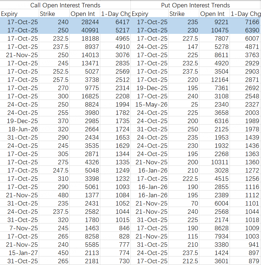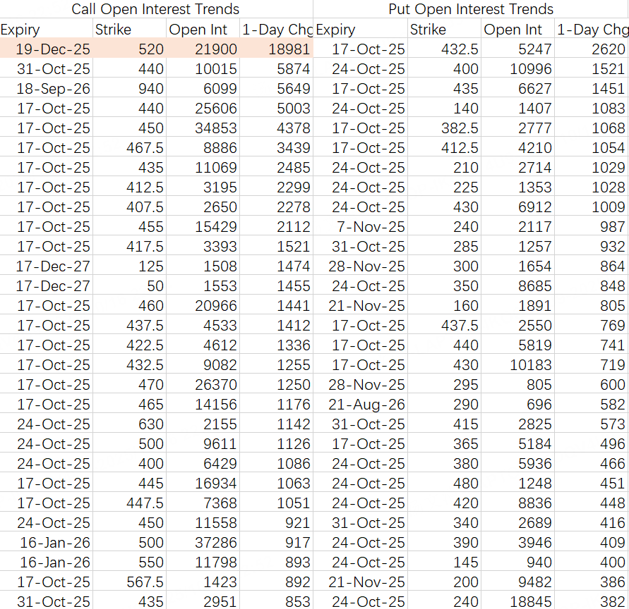 亮点是有大单开仓12月底520call $TSLA 20251219 520.0 CALL$ ,方向不明。我觉得有可能是看涨。