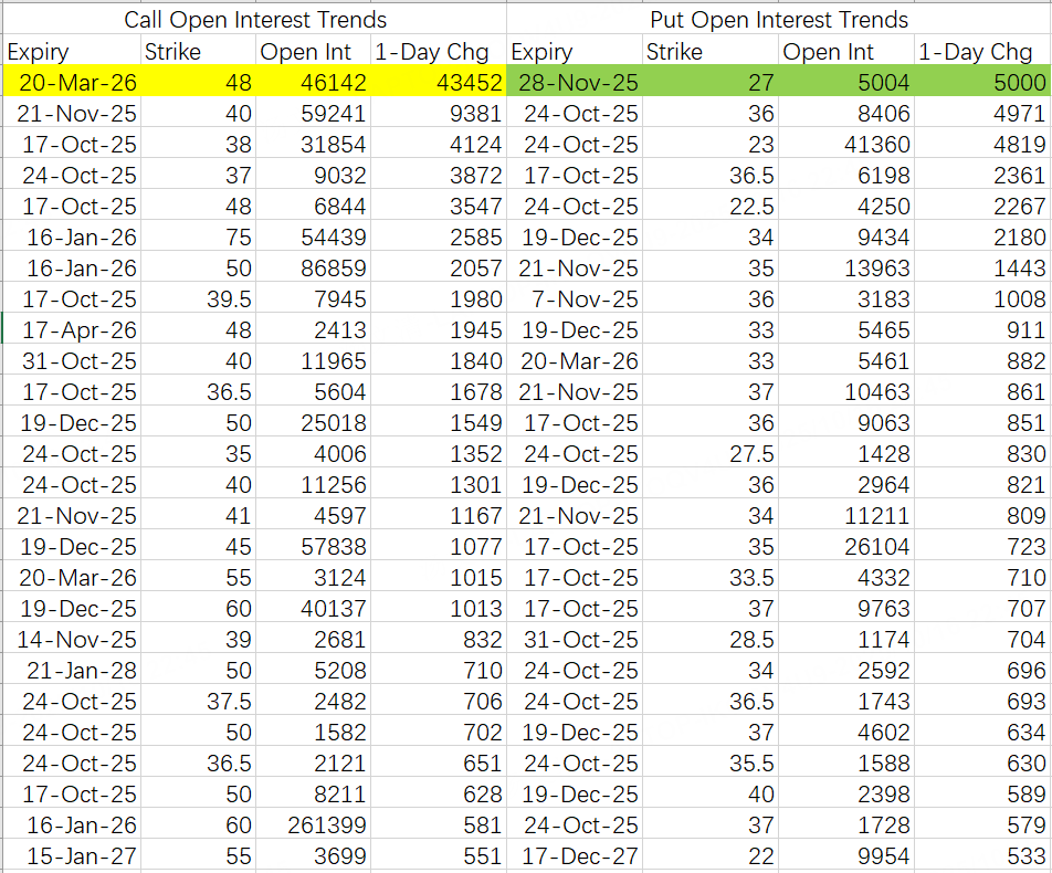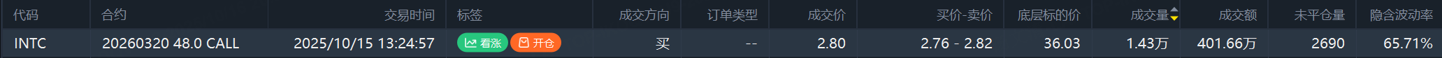 看涨期权大单回归,2026年3月到期48call $INTC 20260320 48.0 CALL$ 开仓4.3万手,成交额约1200多万。