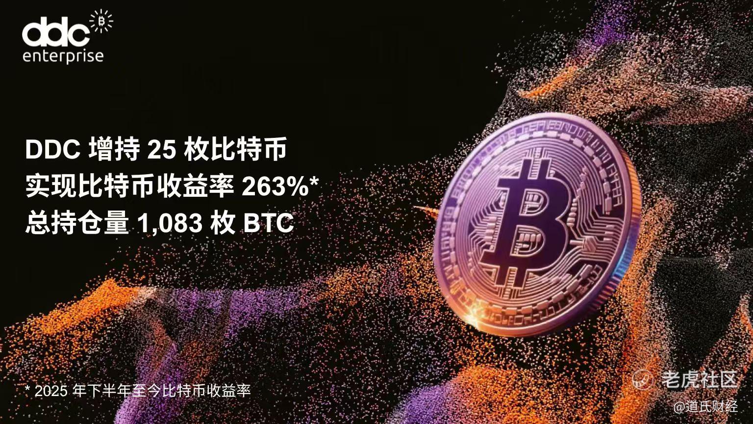 全球领先的亚洲美食平台与企业比特币储备策略创新者 DDC Enterprise Limited(以下简称“DDC”或“公司”) 今日宣布,已额外购入 25 枚比特币(BTC),公司比特币总持有量增至 1,083 枚 BTC。