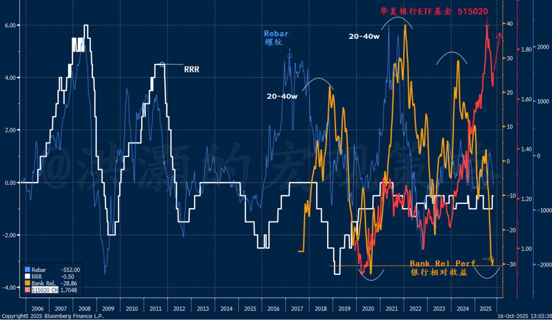我们还可以通过测量“老登股”的相对收益来预测下一个阶段市场里将要跑赢的板块。再次,我们运用中证银行指数的相对收益作为关键指标,并辅以华夏银行ETF基金 515020.CH 的走势作为比较参照(图三)。显而易见,银行板块的表现与存款准备金率和螺纹钢价格息息相关,同时后两个指标领先于银行的相对表现大约20到40周(图三)。当下,银行的相对表现已经在历史最低位附近徘徊,基本上与2020年八月的水平相近。