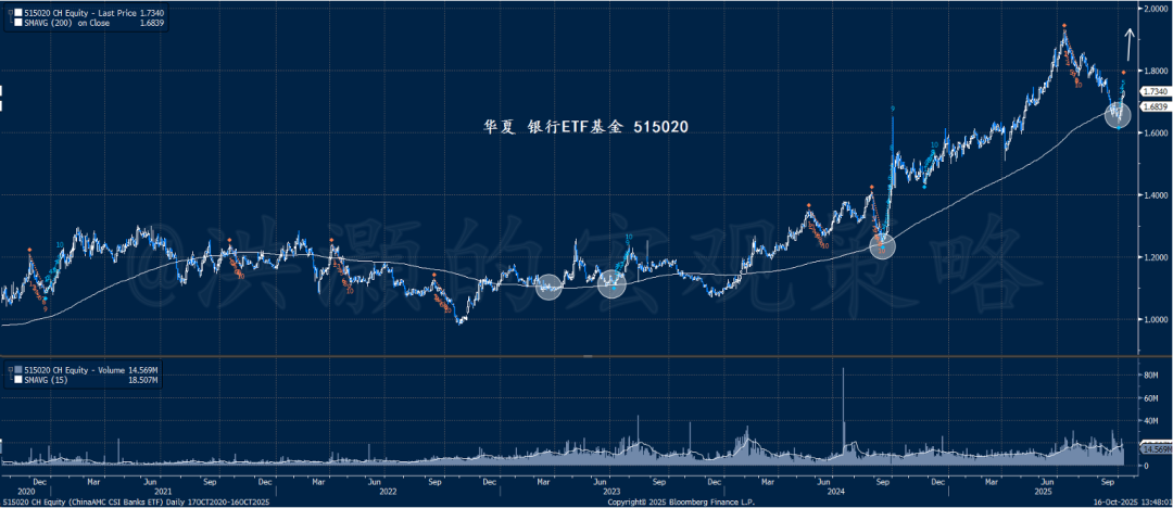图一:以华夏银行ETF基金515020.CH为代表的银行"老登板块"开始从200天线反弹。