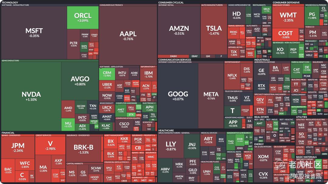 然而,这份积极情绪未能维持至收盘。三大股指全天高开低走,最终集体收跌,道指收跌0.94%,纳指收跌1%。在多数板块承压下,仅半导体板块凭借龙头股的支撑收绿,成为当日市场中少数的例外。