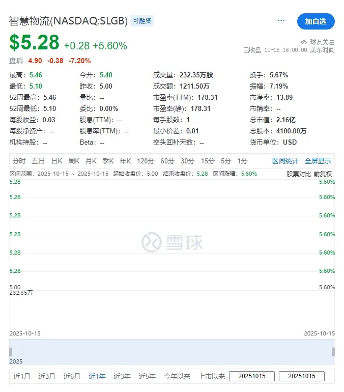 截至首日(2025年10月15日)收市,智慧物流(SLGB)每股收报5.28美元,稍涨5.60%,目前市值约2.16亿美元。