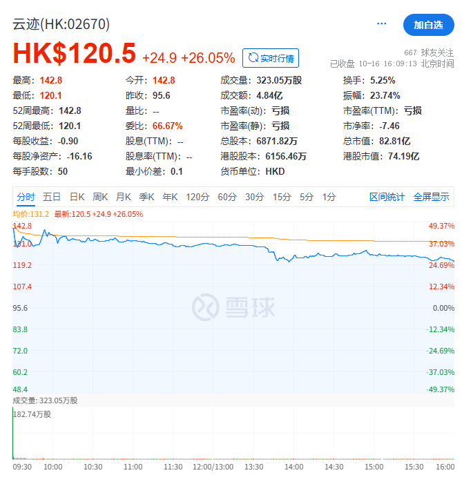 截至首日收市(10月16日),云迹每股报120.50港元,涨26.05%,总市值逾82.81亿港元。