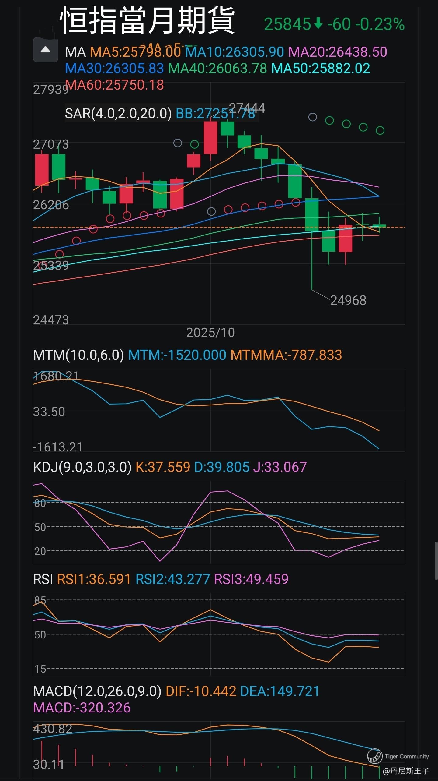 恒生指数位于(10,20,30,40)天移动平均日线之下,(5,10,20)天移动平均日线趋势向下