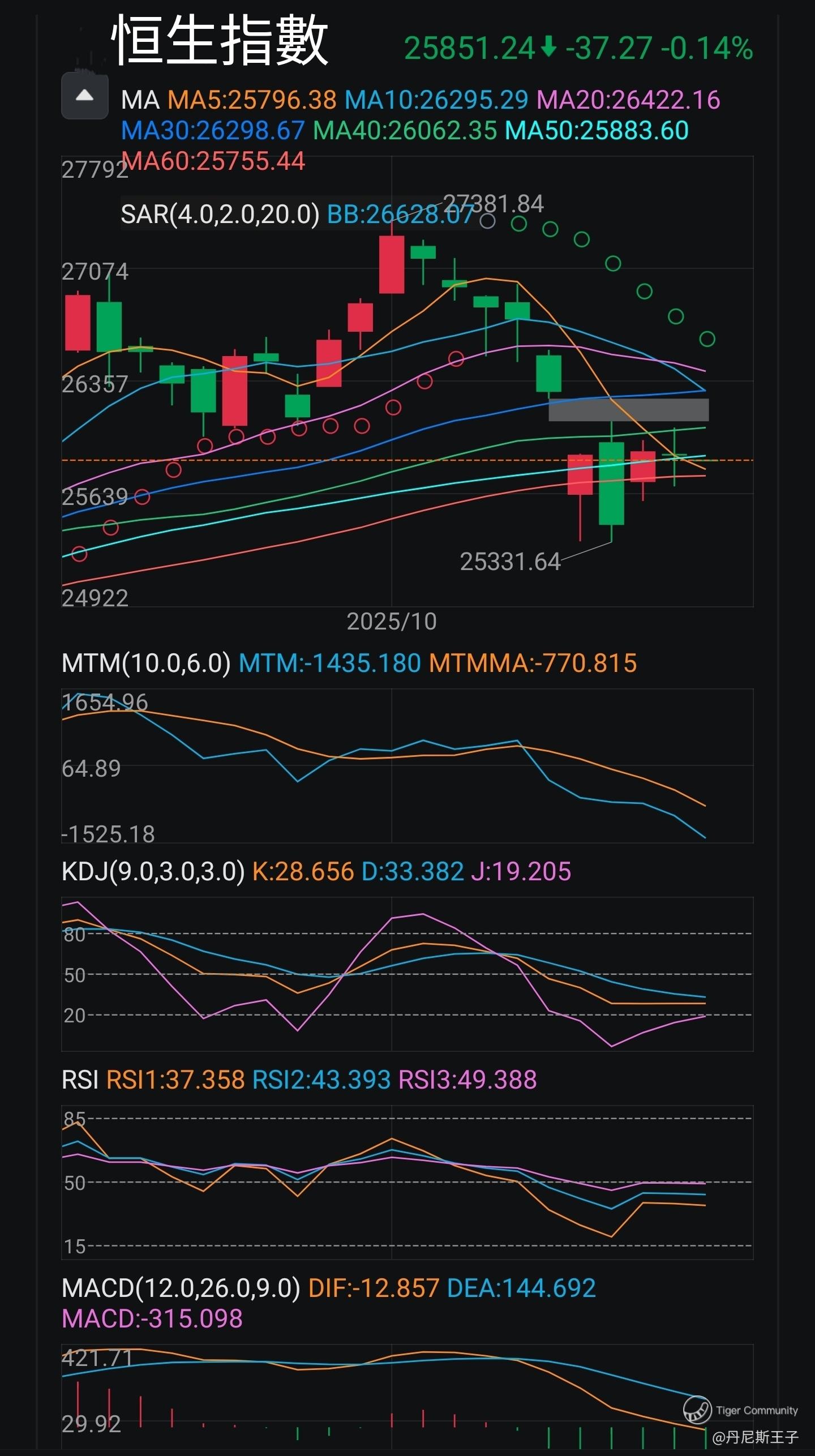 恒生指数短期指标MTM,KDJ趋势向下 , RSI 6天日线数值在50以下,处于弱势。